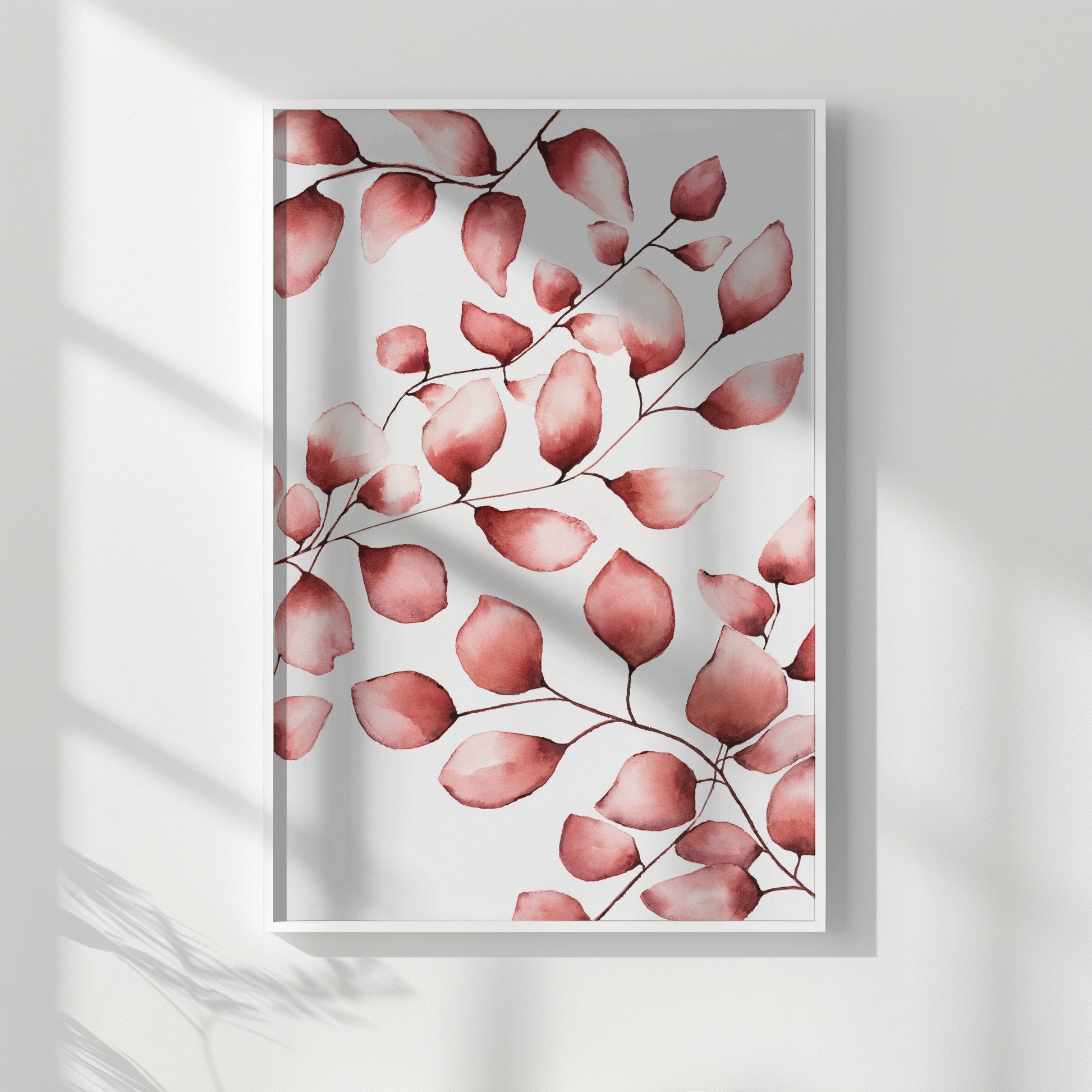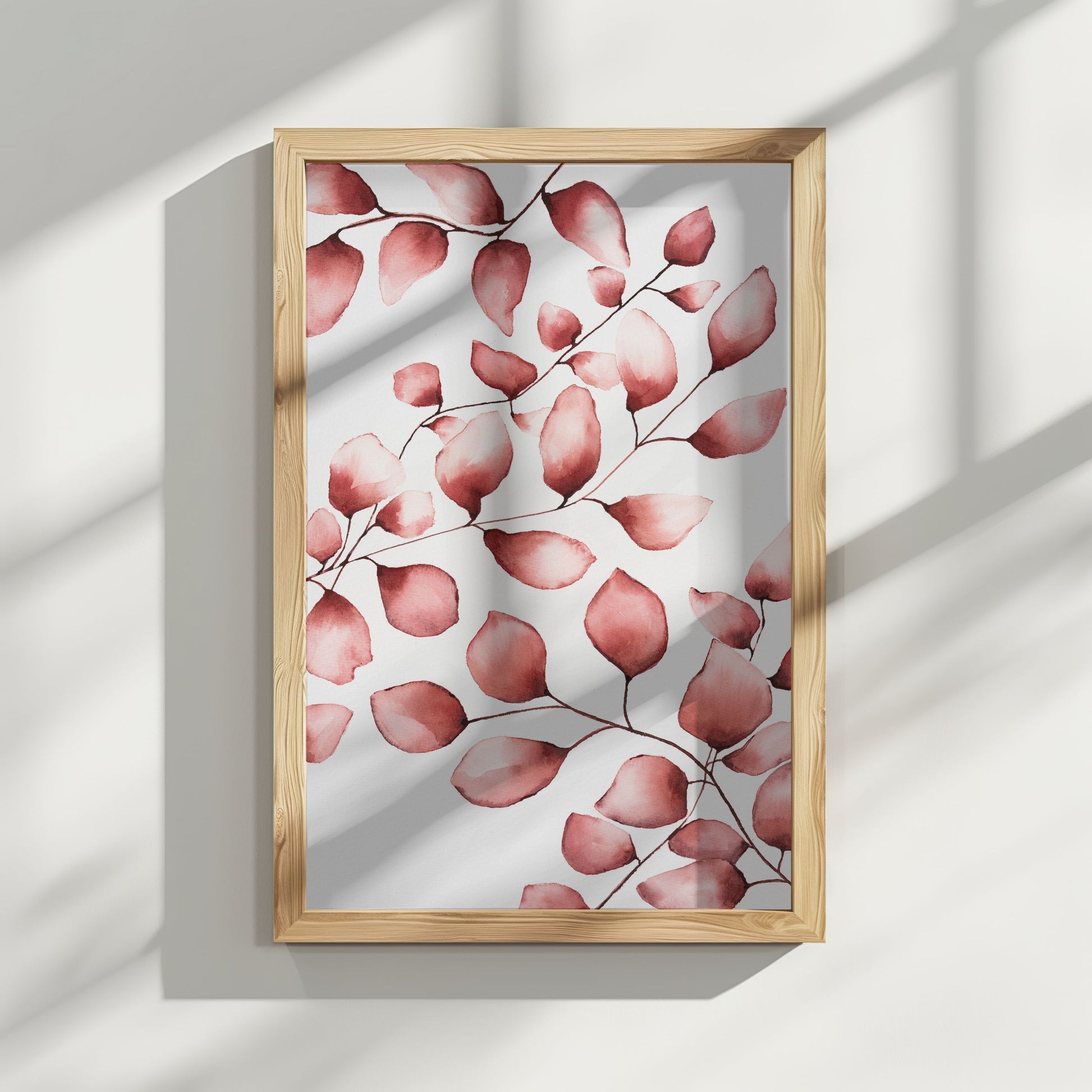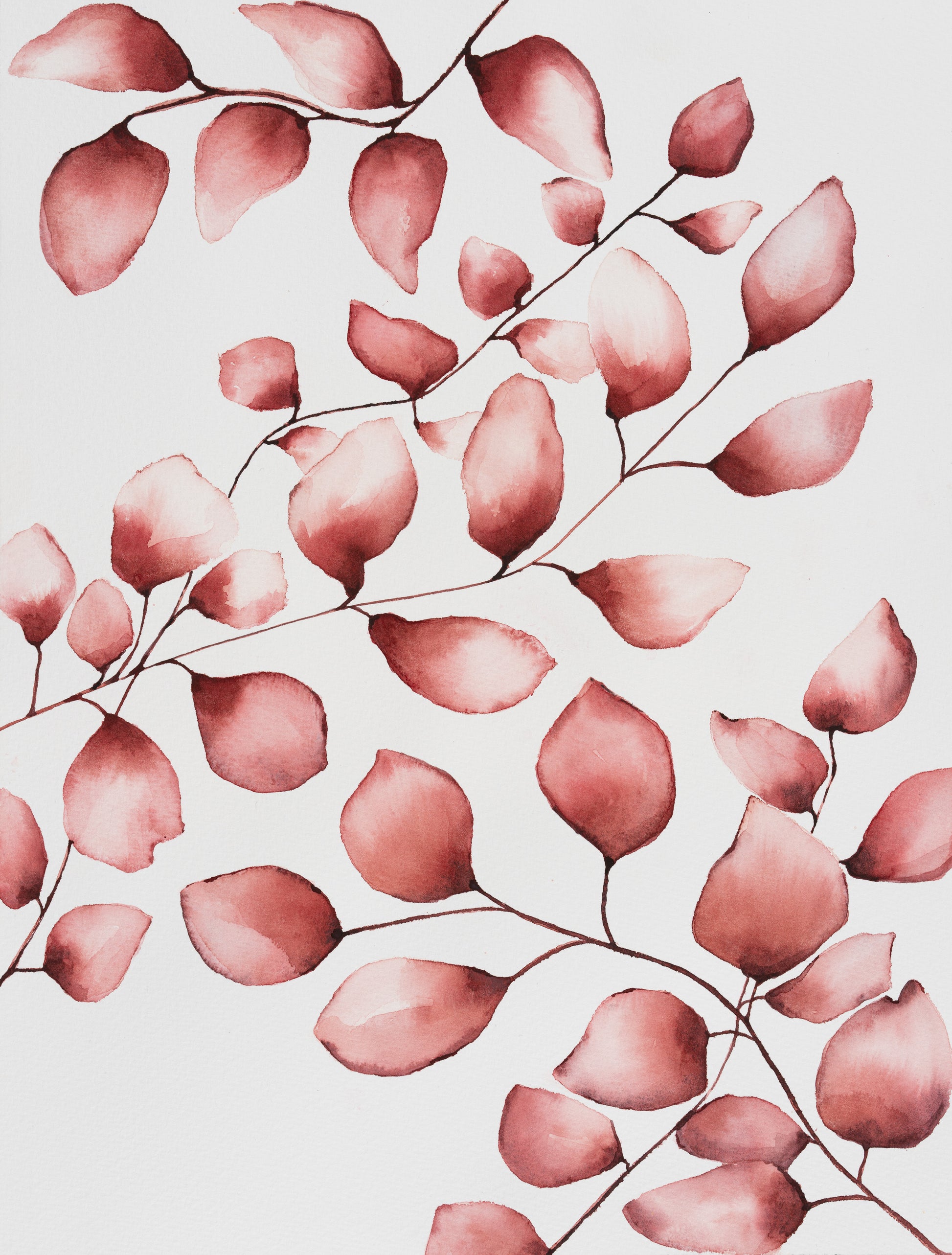 Et let og organisk udtryk af naturens rytme. De varme rosa og rødbrune toner danner fine bladformer, der bevæger sig i bløde linjer hen over papiret – som grene i stille bevægelse.