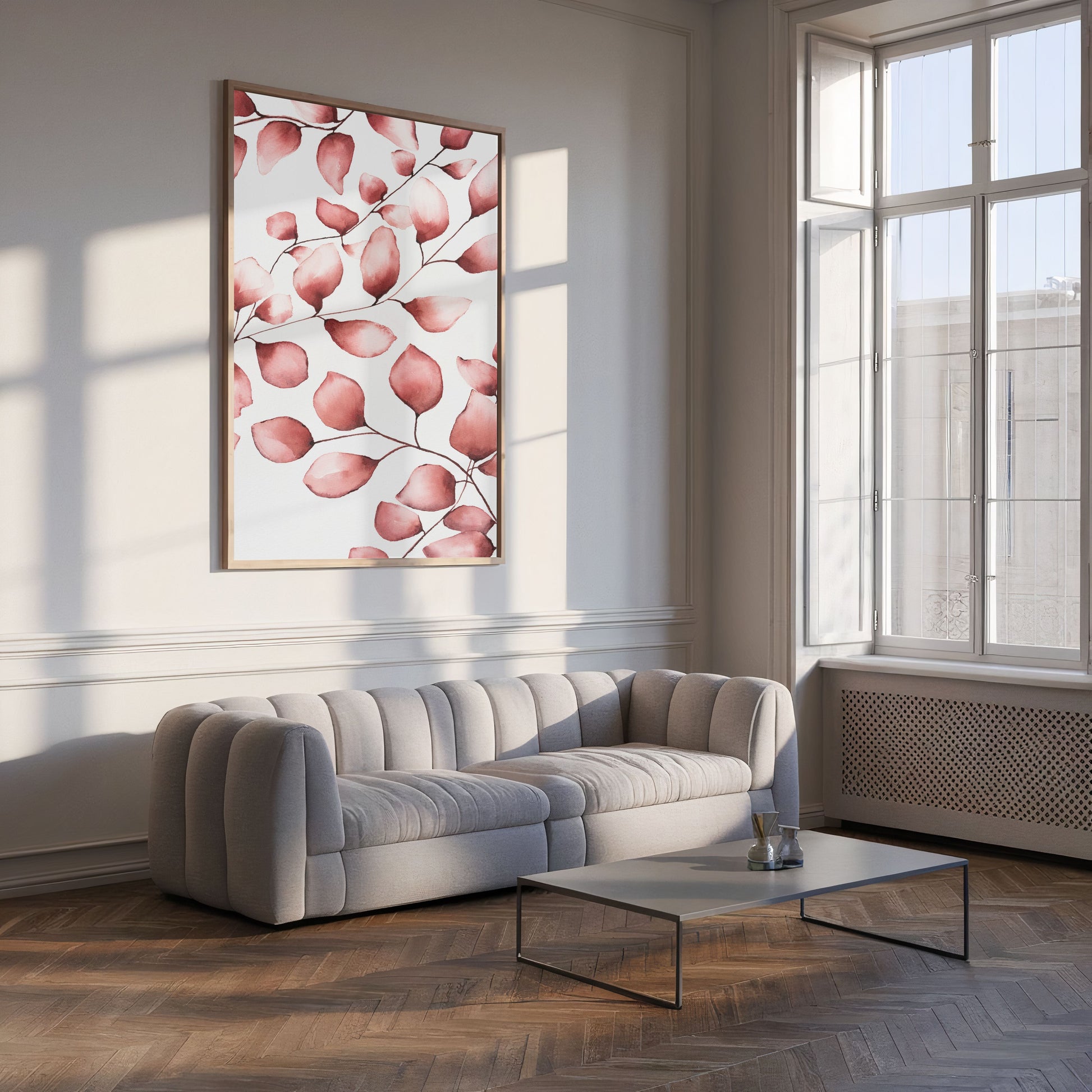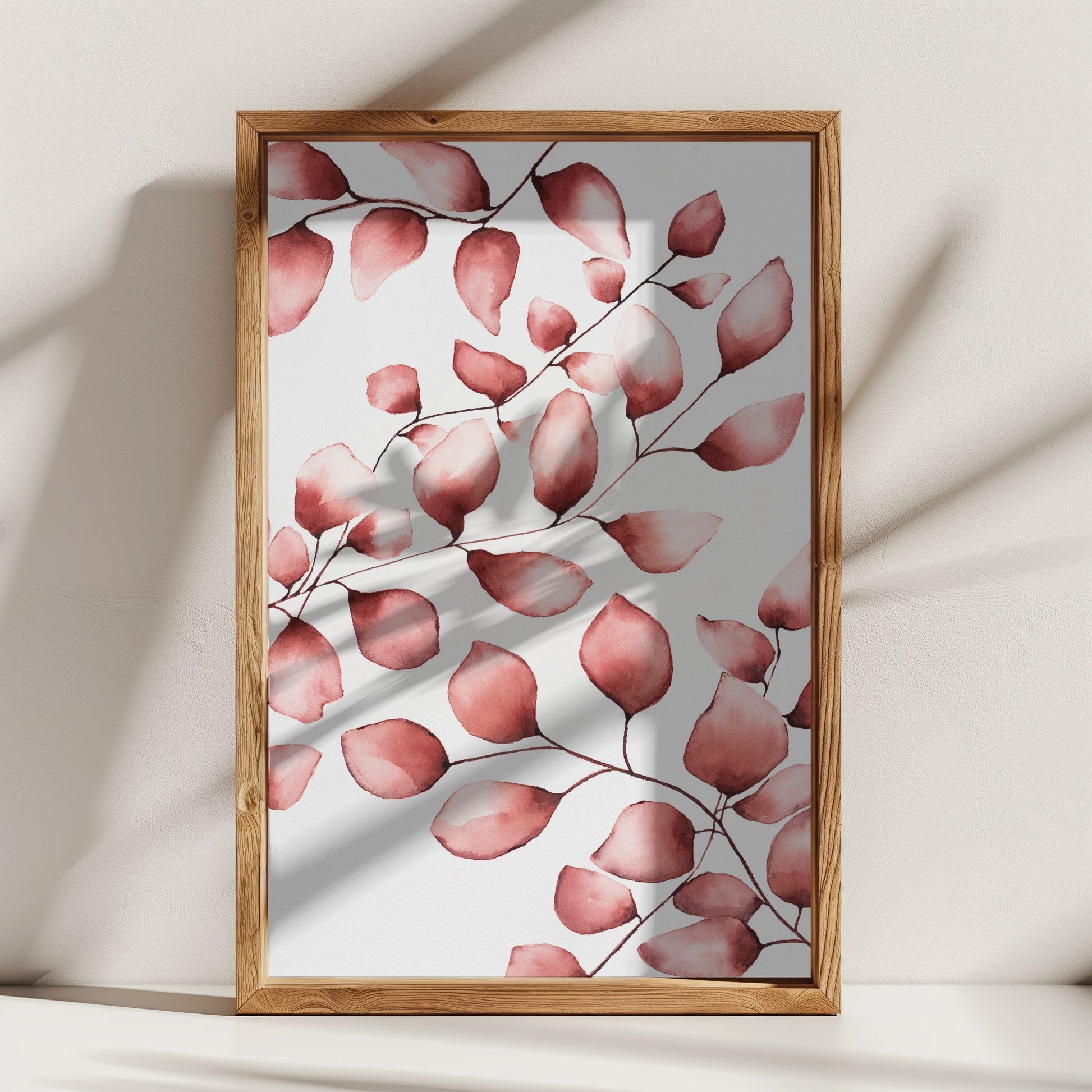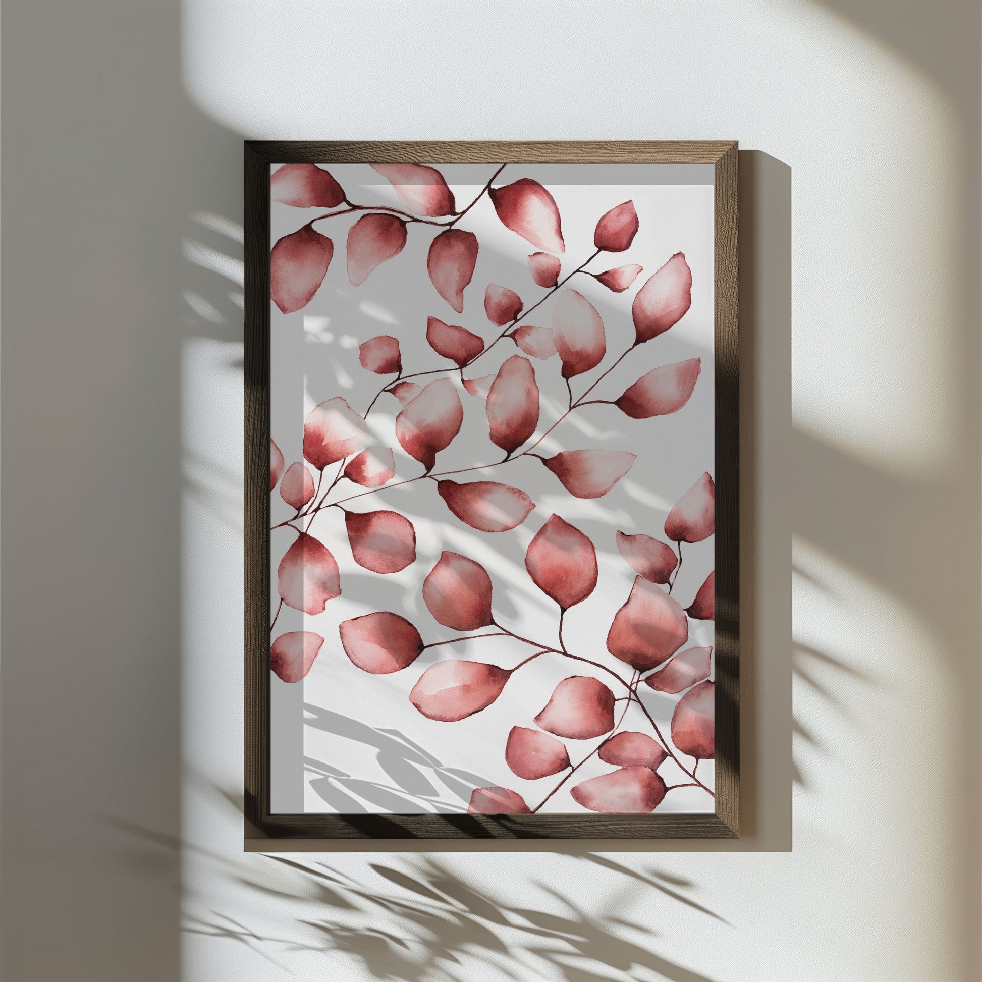 Et let og organisk udtryk af naturens rytme. De varme rosa og rødbrune toner danner fine bladformer, der bevæger sig i bløde linjer hen over papiret – som grene i stille bevægelse.