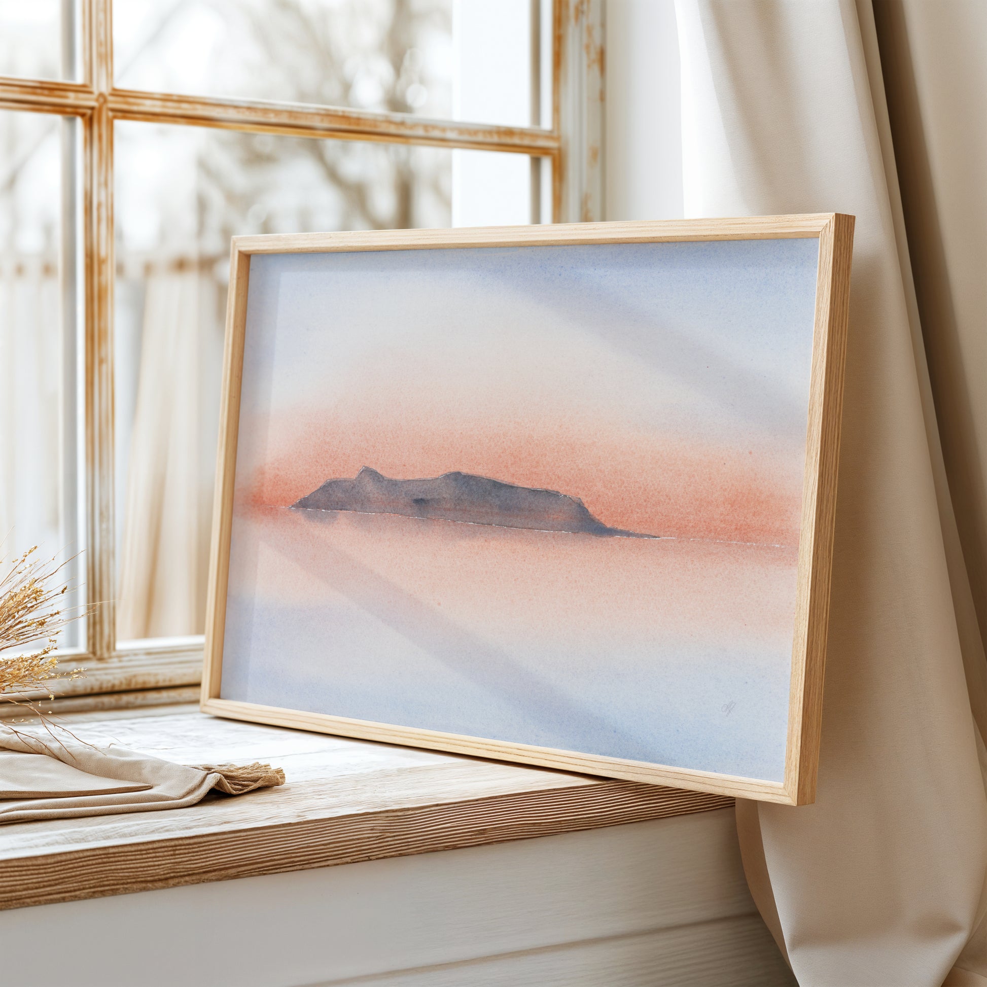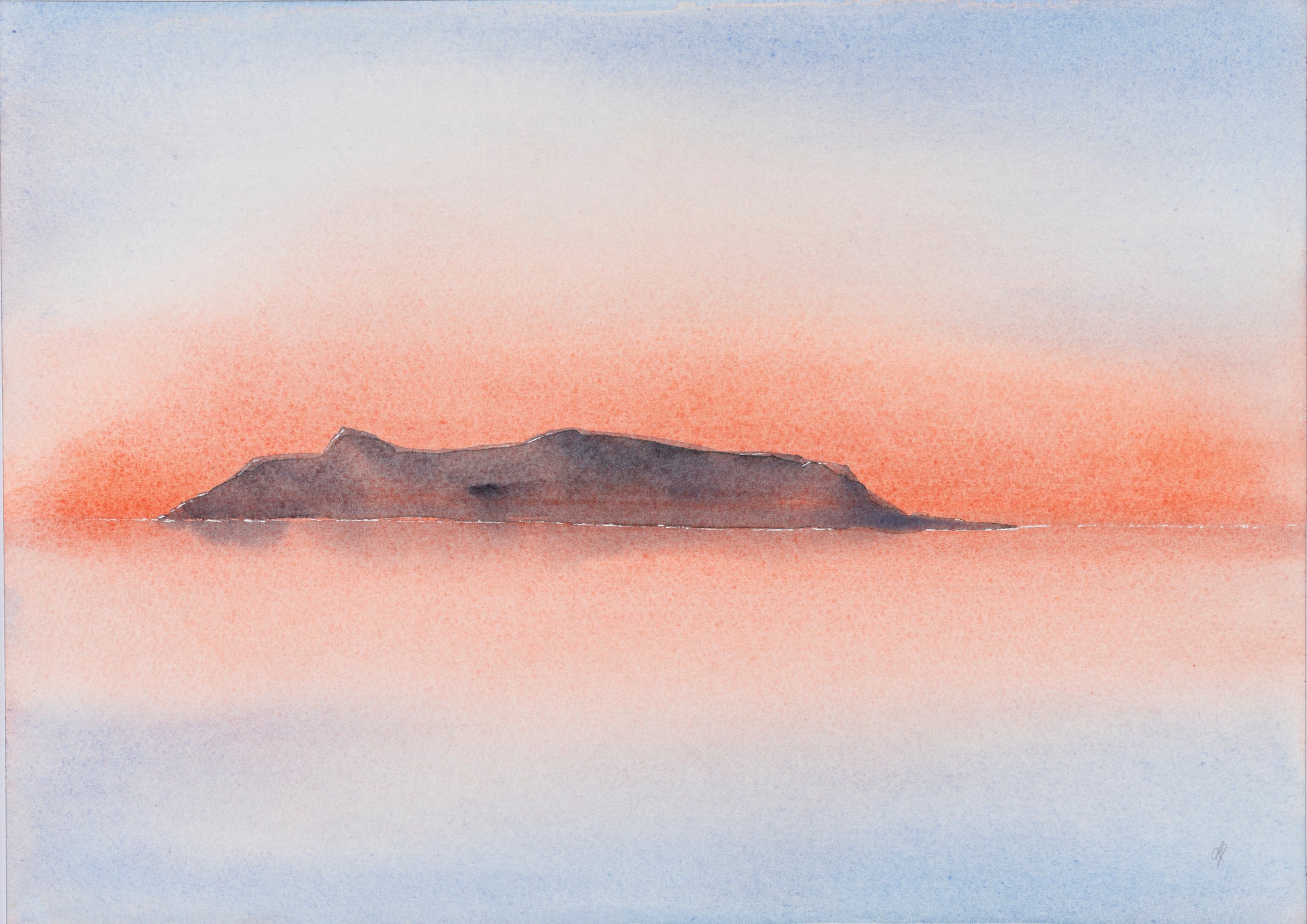 Akvarellen fanger det øjeblik, hvor dagen glider over i stilhed, og farverne blander sig i luftens tynde dis. Et enkelt fjeld anes i det fjerne – som et minde om ro, afstand og tilstedeværelse.