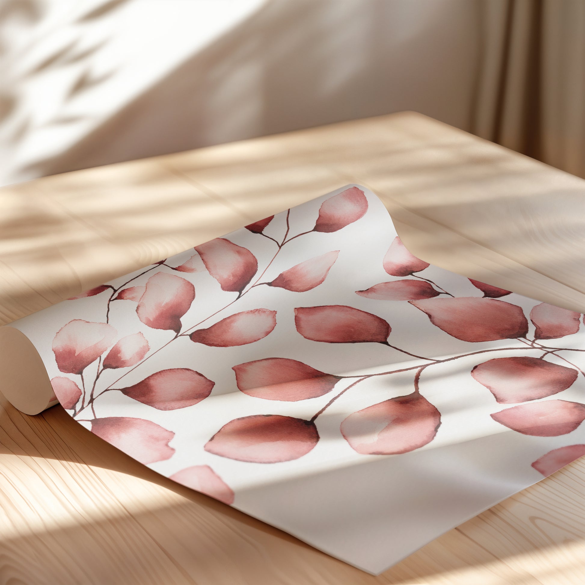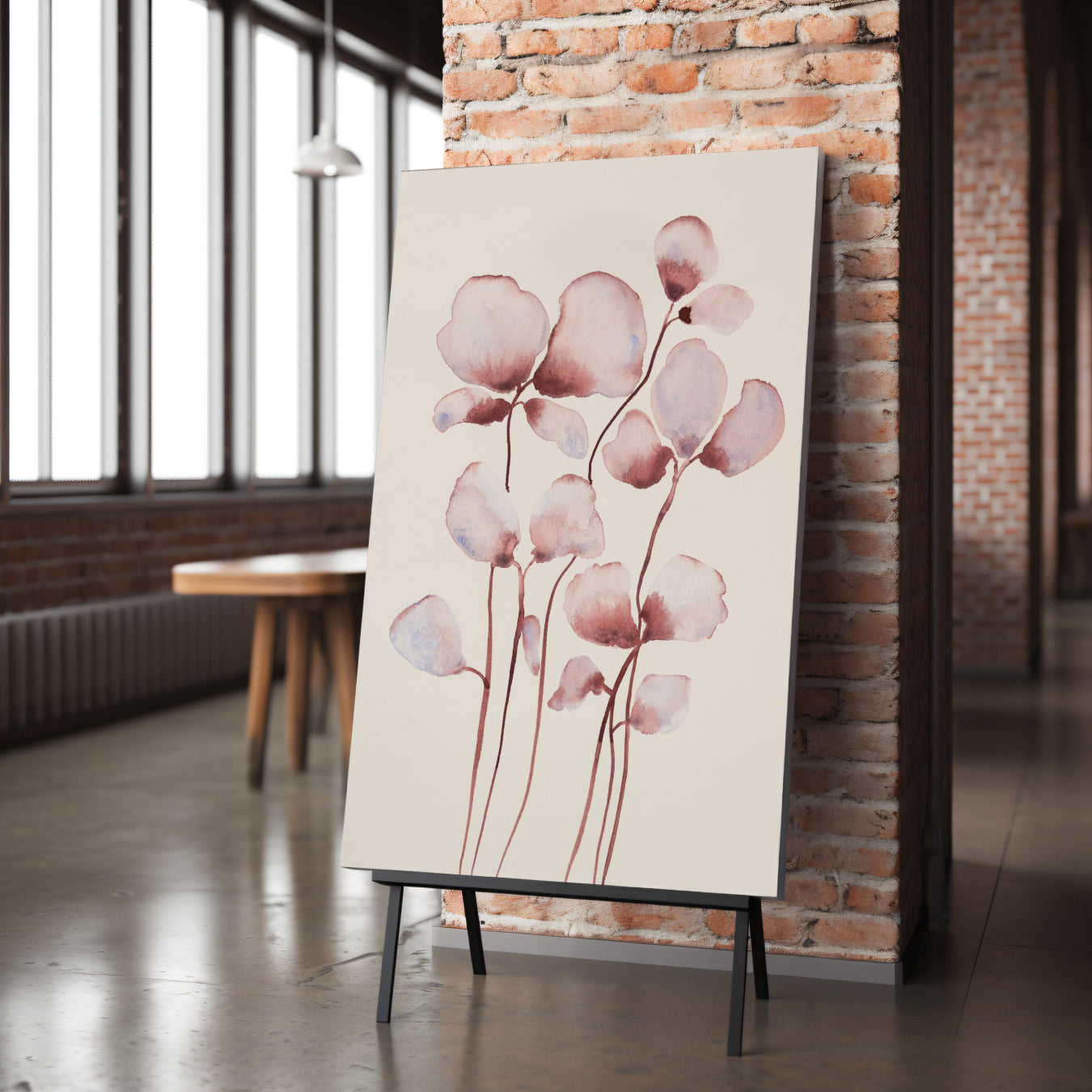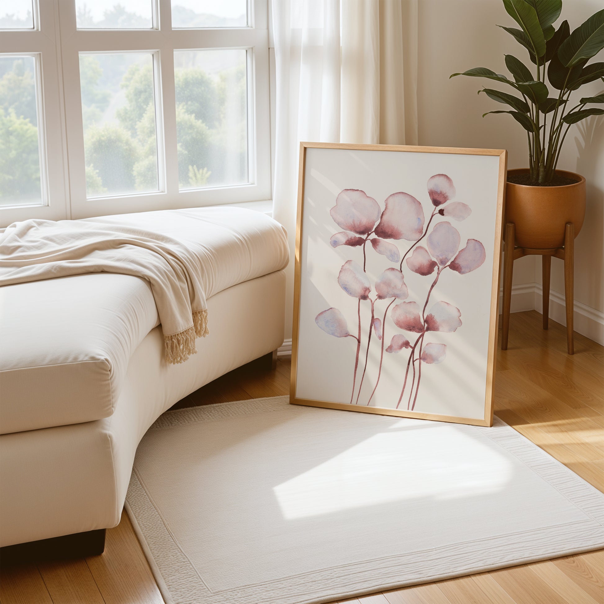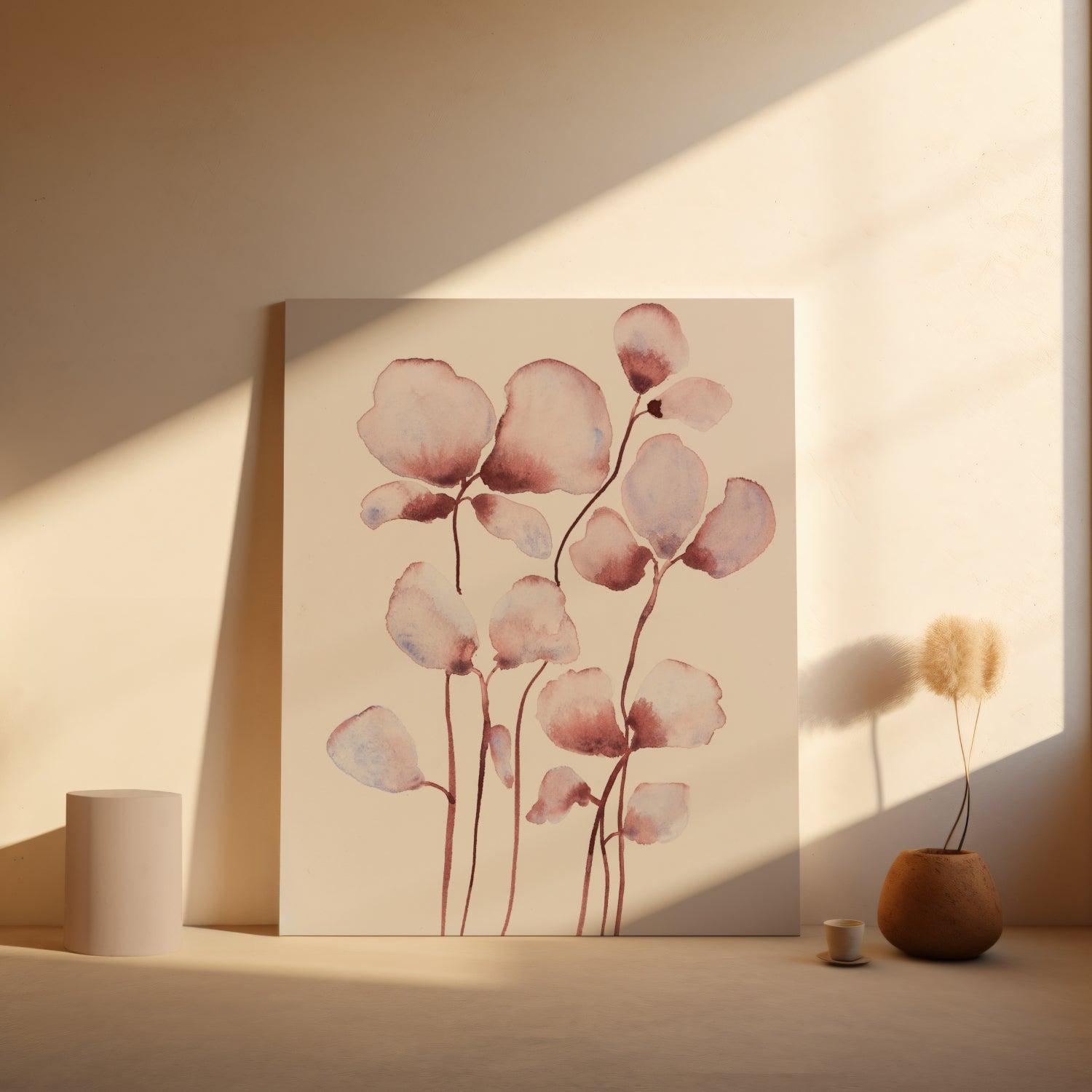 Et let og poetisk udtryk af naturens stilhed. De rosa toner er blidt balanceret med kølige nuancer af blå i denne akvarel, hvor de fine former svæver på papiret som blade i vinden.