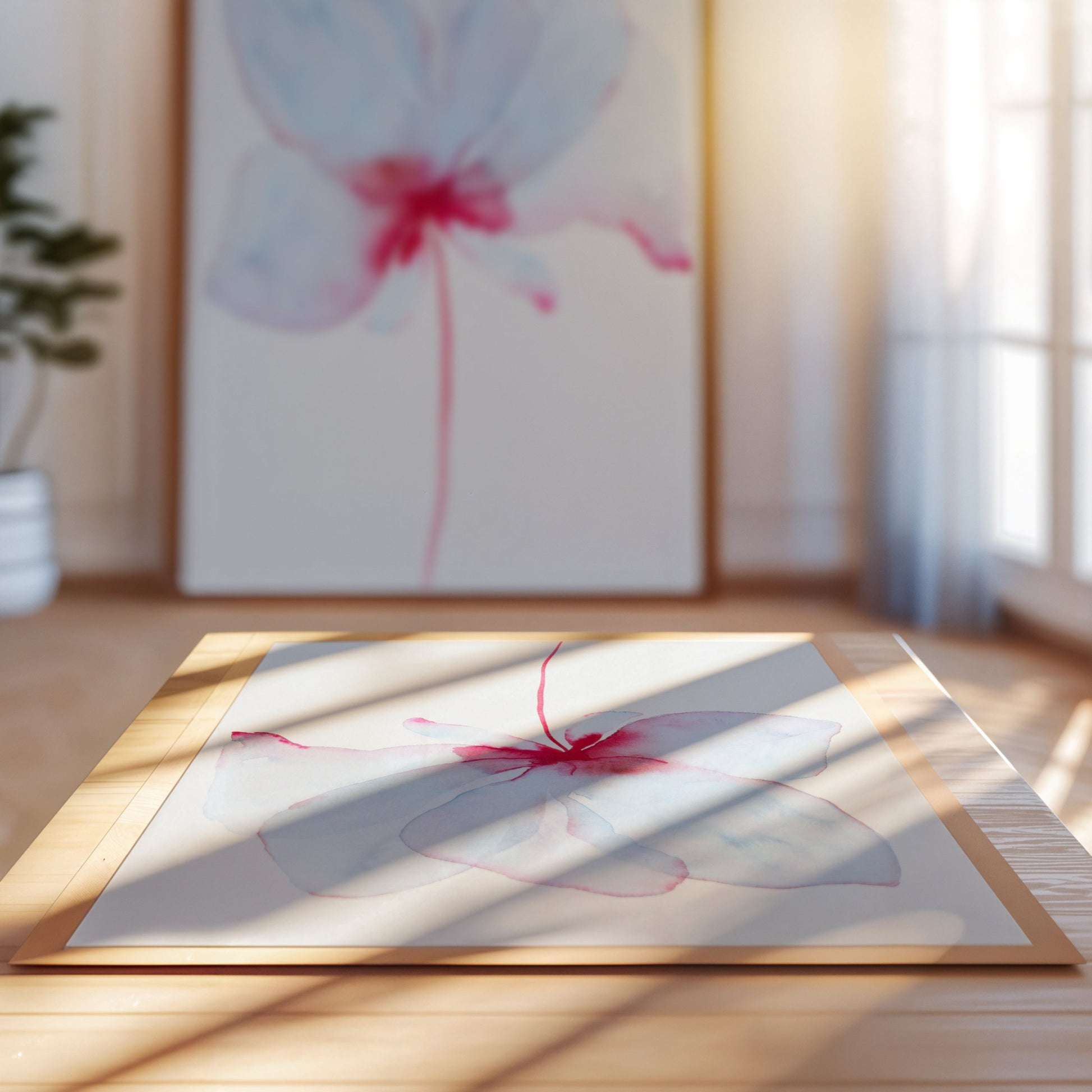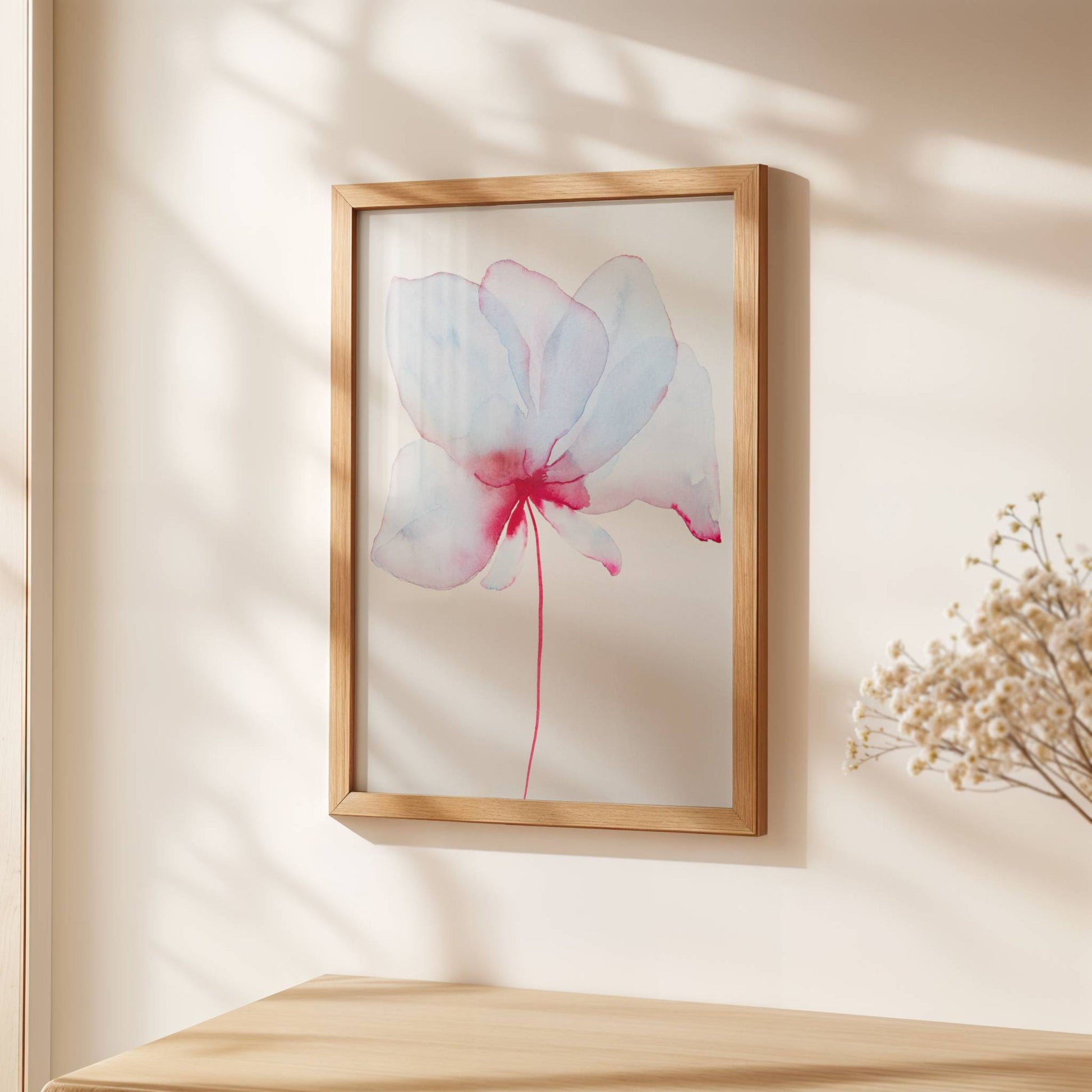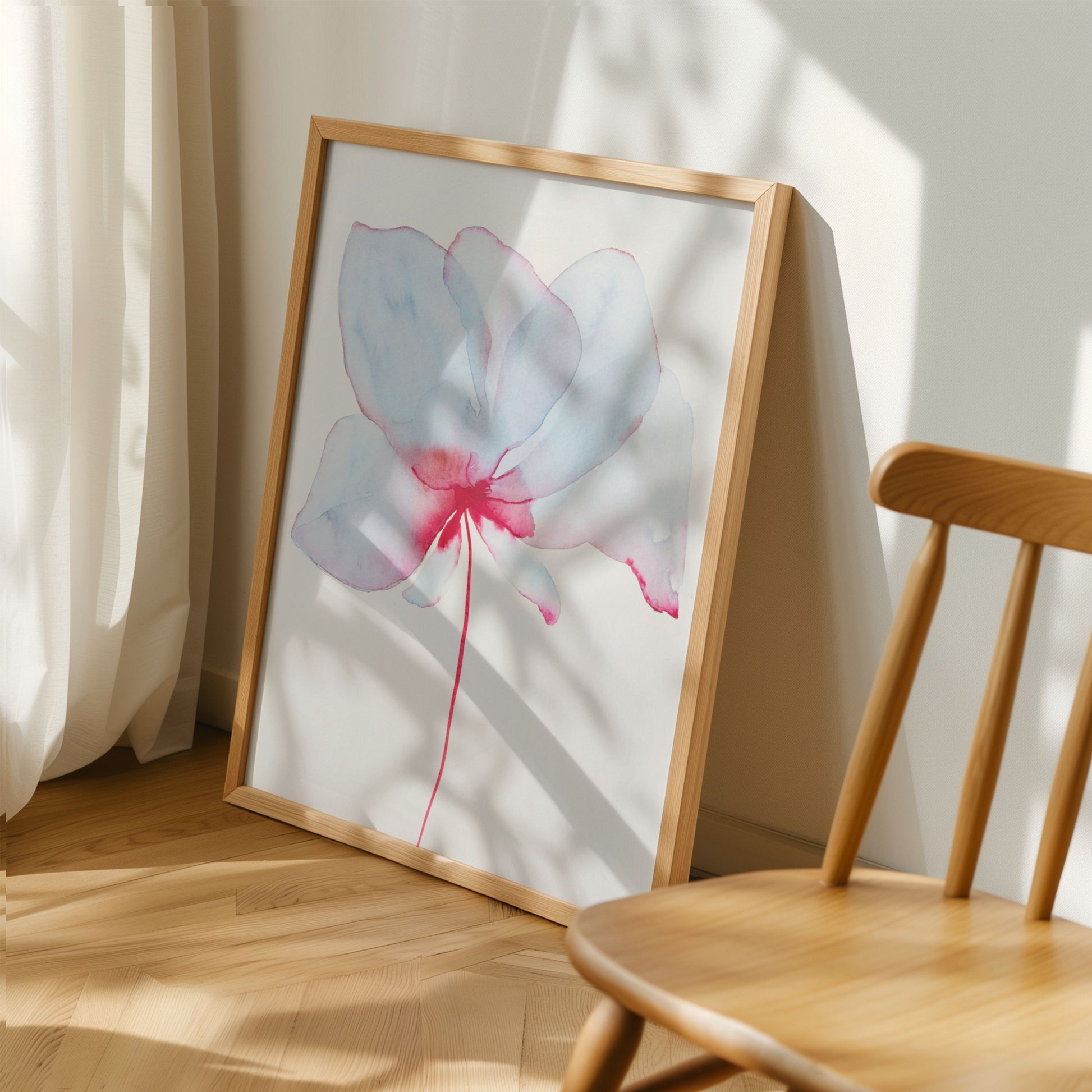 En let og luftig blomst i blå og rosa nuancer – et stille øjeblik af skønhed og styrke.